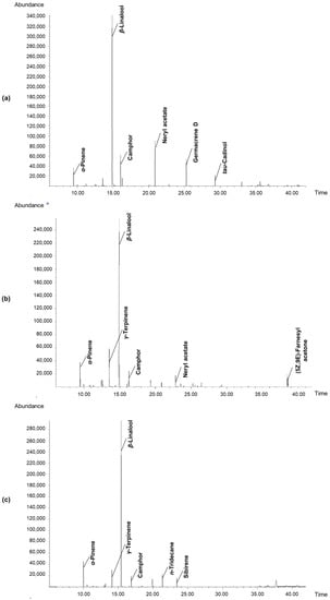 The results from the identification by GC-MS analysis of individual aromatic volatiles in the obtained concretes and the total ion current (TIC) chromatograms with the major compounds (over 3%) are presented in Table 8 and Figure 3, respectively.