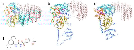 The human NLRP3 protein contains subunits PYD (pyrin domain; residues 3–95), FISNA (Fish-specific NACHT-associated domain; 96–218), LRR (leucine-rich repeat domain; 652–1036) and a central NACHT domain comprising NBD (nucleotide-binding domain; 219–372), HD1 (helical domain 1; 373–434), WHD (winged helix domain; 435–541) and HD2 (helical domain 2; 542–651) (Figure 1). For a long time, the only available experimental structure containing the central subdomains of this protein was a cryo-electron microscopy (cryo-EM) model bound to NEK7, a mitotic kinase-mediating NLRP3 activator (PDB code: 6NPY; Figure 1a). Yet, a substantial portion of the residues (31.8%) in the HD2 region near the small-molecule binding site in this structure was missing. In addition, the conformation of NLRP3 complexed with the NEK7 substrate may differ from the one bound to a small-molecule inhibitor. A cryo-EM structure of an NLRP3 decamer bound to the drug MCC950 (PDB code: 7PZC) was newly released on 26 January 2022 [8], and a crystal structure with an MCC950-like inhibitor (PDB code: 7ALV) was released on 20 October 2021 [9]. However, those two structures had not yet been deposited to the PDB when structural predictions were performed for this study.
