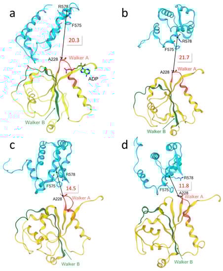 Relative positions between two key residues R578 and A228 of the MCC950 binding pocket in (a) the NLRP3-NEK7 complex structure (PDB code: 6NPY), (b) model 1 generated by AlphaFold, (c) model 4 by AlphaFold and (d) model 1 by RoseTTAFold. The distance between the α-carbon atoms of R578 and A228 was 20.3 Å, 21.7 Å, 14.5 Å and 11.8 Å in (a–d), respectively. Red: the Walker A motif (GAAGIGKTIL); Green: the Walker B motif (RILFMDGFDELQGAFDEHI) [19]; Gold: NBD; Cyan: HD2. Other domains were omitted for clarity.