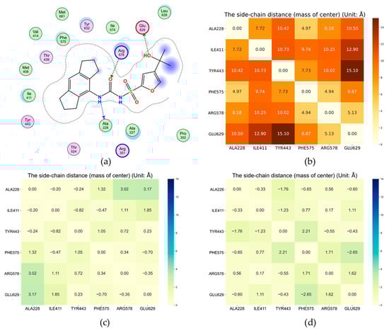 (a) Major interactions between MCC950 and NLRP3 in 7PZC; (b) side-chain distances between pairs of key residues at the binding site of MCC950 in 7PZC; side-chain distances between pairs of key residues in (c) AF model 4 and (d) RF model 1 relative to those in 7PZC (unit: Å). The magnitudes of the numbers in (c,d) indicate deviations from the experimental structure, and the plus and minus signs indicate larger or smaller distances compared to those in 7PZC.