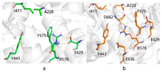 In addition to the hydrogen bonds formed between the amide group of MCC950 and the protein, the tricyclic head group of the small molecule also participated in hydrophobic interactions with neighboring residues involving I411, Y443 and F575. In addition, the terminal carboxylate group engaged H-bonds with G629 (Figure 4a). We, therefore, compared the pairwise distances of related residues for all AF and RF models with those in 7PZC, to obtain a detailed measurement of binding pocket structural integrity. It was observed that, on average, AF model 4 had the smallest discrepancy from the experimental results among all AI models (Figure 3). Yet, the green areas shown in Figure 3c suggested a loosely packed core. In particular, a salt bridge between R578 and E629 was observed in the AF models, same as in 7PZC (Figure 4a), which further stabilized the complexation between the small molecule and the protein, whereas, in the RF models, R578 instead formed salt bridges with two other negatively charged residues, E636 and D662 (Figure 4b).