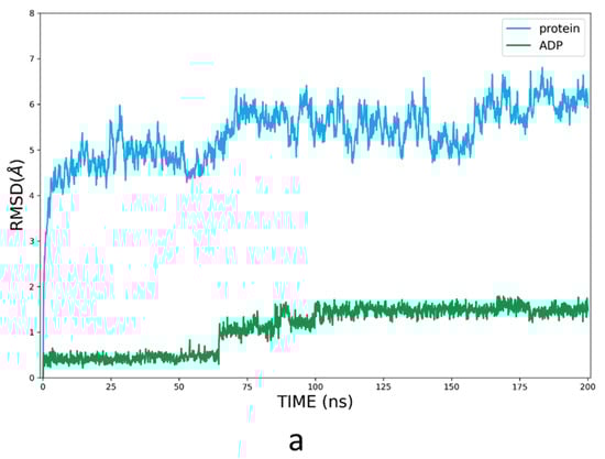 To further assess the use of AI models in small-molecule drug discovery, we performed molecular docking of MCC950 for each model of AF and RF. However, even the top-ranked models produced only partially correct binding modes. So, molecular dynamics (MD) simulations were carried out to refine the poses by considering the induced fit and protein dynamic effects. To keep the Walker A moiety from shifting, ADP was docked back into its binding site, as in the AI models, then simulated by MD for 200 ns. It turned out the RF model 1 structure could hardly accommodate ADP at the corresponding site. So, we only performed a 200 ns MD simulation of AF model 4 bound to ADP (Figure 5a). Another difficulty was that part of the FISNA domain missing from the experimental structure in AF Model 4 occupied the entrance of the binding pocket. Therefore, ligand MCC950 was docked to the protein–ADP conformation from the last frame of the simulation with the PYD and FISNA subdomains truncated, then simulated for another 200 ns (Figure 5b).