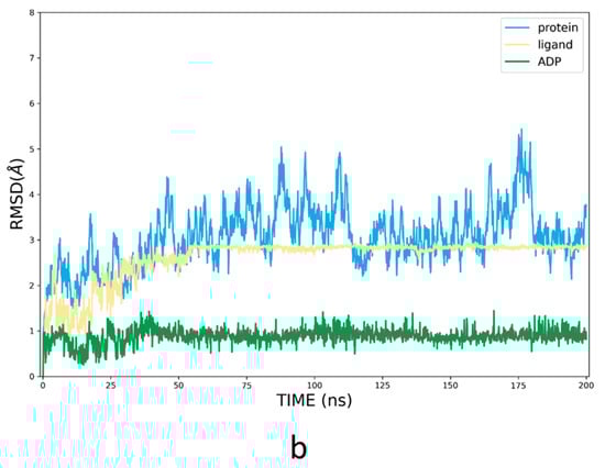 RMSD values plotted relative to the first frame (in Å) of the production phase based on the MD trajectories of (a) AF model 4 bound to ADP and (b) AF model 4 bound to ADP and MCC950. Blue line: Cα RMSDs of the protein; green and yellow lines: heavy-atom RMSDs of ADP and the ligand, respectively.
