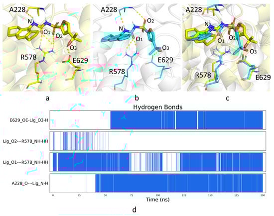 Compared to the experimental structure, ligand MCC950 engaged similar hydrogen-bonding interactions with R578, A228 and G629 (Figure 6). The distance between the α-carbon atoms of R578 and A228 was reduced to 14.1 Å from the initial 14.5 Å, moving closer to the measured value of 12.7 Å in 7PZC. It was challenging to fully optimize the assembly of subdomains through MD simulations, as conformational changes involving the main chain typically require a long time to converge.