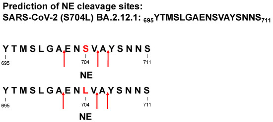 FASTA format sequences of the S protein peptides SARS-CoV-2 (Wuhan, WIV04, UniProtKB: P59594, https://www.uniprot.org, accessed on 5 July 2022) 695YTMSLGAENSVAYSNNS711 or including the amino acid substitution S704L 695YTMSLGAENLVAYSNNS711. Both peptides were assessed for potential cleavage sites for human NE (EC 3.4.21.37) using in silico analysis of the program ExPASy Peptide Cutter (https://web.expasy.org/peptide_cutter/, accessed on 5 July 2022).