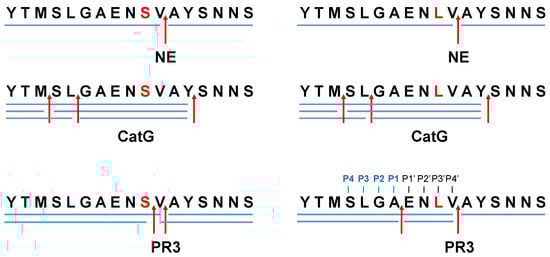 Protease-catalyzed hydrolysis ensues specifically between the P1 and P1′ peptide bond. Prediction models are used to forecast the protease-specific substrate cleavage; therefore, both peptides 695YTMSLGAENSVAYSNNS711 (S704 peptide) and 695YTMSLGAENLVAYSNNS711 (L704 peptide), including the amino acid substitution S704L, which might change the proteolytic digest by proteases, were assessed for cleavage prediction approach for NE (ExPASy (https://web.expasy.org/peptide_cutter/, accessed on 5 July 2022). As a result, NE hypothetically digested both peptides in the same manner, where the cleavage sites of the peptides occurred between 701AE702, 705VA706, and 706AY707 (Figure 1 and Figure S1). In order to evaluate these data, S704 and L704 peptides were synthesized, treated with NE, CatG, or PR3, and the digestion pattern was analyzed by HPLC and MALDI-TOF-MS as well as high-resolution ESI-QTOF-HRMS. Strikingly, NE catalyzed the hydrolysis of S704 and L704 peptides exclusively at 705VA706 (Figure 2 and Figures S2–S8). CatG hydrolyzed the peptide bond at 697MS698, 699LG700, and 707YS708, which were identified for both peptides. PR3 digested the S704 and L704 peptides in the same manner as shown for NE; however, additional cleavage sites were detected between 704SV705 for the S704 peptide that was eliminated in the L704 peptide. In contrast, a novel cleavage site was located between 701AE702, which was most likely controlled by the P3′ position by the amino acid exchange from S to L.