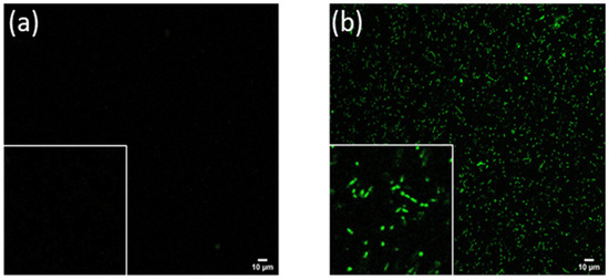 As shown in Figure 1, the signal intensity of L. casei carriers increased approximately 24-fold upon incubation of cells with an MG juice (Figure 1b) as compared to the auto-fluorescence signal from the control cells (Figure 1a). Differences in the fluorescence signal intensity between the controls and the modified cells with juice phenolics was statistically significant with a p-value ≤ 0.05. The zoomed-in views in Figure 1b indicated that the cell carriers retained the cellular structure after the encapsulation process, and the encapsulated material was localized relatively uniformly across the intracellular compartment.
