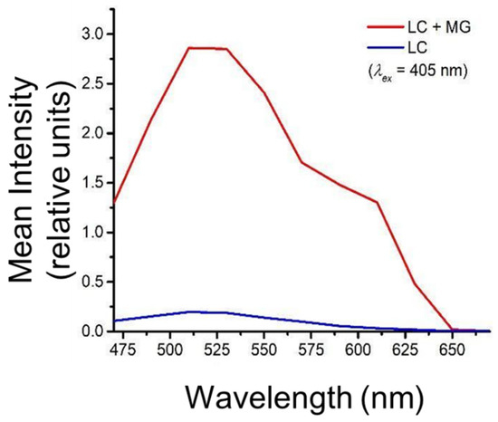 Further, lambda emission scans (Figure 2) were collected in the range of 470–670 nm with a 20 nm step size with an excitation wavelength at 405 nm. The results in Figure 2 revealed the fluorescence spectral profile of phenolic compounds of MG encapsulated in the L. casei cells. The cells encapsulated with MG juice showed a broad emission distribution over a range of 450–630 nm with a peak maximum around 515 nm and a secondary peak around 590 nm.