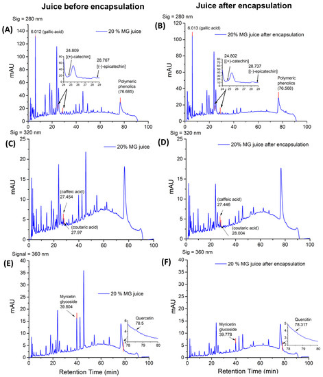 Chromatograms corresponding to absorbance peaks at 280 nm (A,B), 320 nm (C,D), and 360 nm (E,F) with assigned peaks for different phenolic compounds from 20% MG juice before (left) and after (right) encapsulation. Insets in Figure (A,B) illustrate a zoomed-in chromatogram region between a retention time of 24 to 29 min on the HPLC column to highlight the assigned peak for catechin and epicatechin in juice before and after encapsulation, respectively. Insets of (E,F) ill zoomed-in chromatogram section between the retention time of 78 to 80 min on the HPLC column to highlight the assigned peak for quercetin in juice before and after encapsulation.