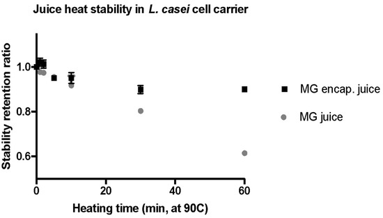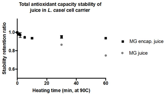 One of the important functionalities of encapsulation carriers is to protect the bioactive compounds from adverse environmental factors and food processing conditions. These adverse conditions may cause damage by oxidation, less favorable pH, and thermal induced reactions in bioactive compounds in food matrices. In order to produce a shelf-stable and microbially safe food, thermal processing methods such as pasteurization or sterilization are commonly used. Thus, in this study the effectiveness of the selected bacterial carrier in protecting and stabilizing the encapsulated juice polyphenols was evaluated. To evaluate the thermal stability of encapsulated bioactives, the cells were heat-treated at 90 °C for 1, 2, 5, 10, 20, 40, and 60 min in a temperature-controlled water bath. The heating conditions were selected based on prior studies [9,61]. After the heat treatment, the cell-encapsulated polyphenolics were extracted using the methods described in Section 3.10 of the material and methods section. The total antioxidant concentration of the extract was then measured using the FRAP assay. The control group of cells with encapsulated compounds but without the heat treatment were also extracted using the same approach and used for calculating the retention ratio during the treatment. The results in Figure 4 illustrate the percentage of total antioxidant capacity retained at each time point during the heating process. As observed in Figure 4, the bacterial carrier effectively protected the encapsulated compounds during thermal treatment. Approximately 93% of the antioxidant capacity for the encapsulated MG juice was retained after 1 h of heat treatment (Figure 4), whereas only 74% of the initial antioxidants were preserved without using encapsulation after the heat treatment of juice for 1 h. These observations indicated that cell carriers can effectively protect encapsulated antioxidant compounds against thermal stress.
