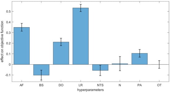 Figure 2, Learning Rate (LR) and Activation Function (AF) are the most influential settings among the hyperparameters with positive effect. Dropout (DO) has a less relevant effect, while the other hyperparameters have no or very little effects. For these hyperparameters (