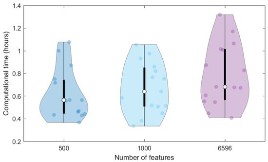 Figure 3. The higher the data dimensionality, the higher the variation of computational times among the replicates and the higher the average time required for the network training, which varies from 0.62 to 0.67 and 0.79 h for 500, 1000 and 6596 dimensions, respectively. Therefore, the use of SPCA scores can also moderately reduce the time needed for network training, which can however have a more relevant effect when considering the large number of architectures to be tested in the tuning phase.