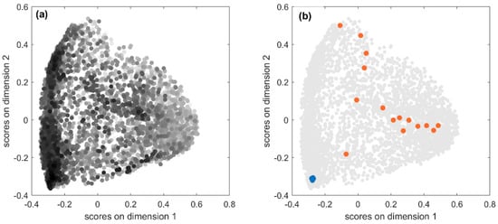 Figure 4a, the score plot of the first two MDS dimensions is shown: each point represents one of the 5233 predicted fingerprints, near points indicate similar predicted fingerprints, while far apart points indicate very dissimilar fingerprints. Fingerprints are coloured in a greyscale, the higher the similarity to the true fingerprint, the darker the colour. Therefore, looking at the point distribution in the MDS plot, it can be seen that well-predicted structures were mainly clustered in the left-bottom corner. This may indicate the existence of some relationships between prediction accuracy and chemical features. To better understand this issue, we further explored results.