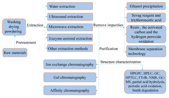 The physical, chemical, and biological properties of polysaccharides mainly depend on the type, ratio, and sequence of monosaccharides; their molecular weight; the configuration of the glycosidic bonds; the types of glycosidic bonds; and the positions of the glycosidic bonds [31]. High-performance gel permeation chromatography can not only be used to determine the homogeneity of polysaccharides, but can also be used to determine the molecular weight [32]. Partial acid hydrolysis, periodic acid oxidation, Smith degradation, high-performance liquid chromatography, gas chromatography, and high-performance thin-layer chromatography are also used to determine the composition of monosaccharides [33]. Nuclear magnetic resonance spectroscopy is used to determine the ratio of monosaccharides and anomeric bonds [34]. Gas chromatography-mass spectrometry is used to determine linkage positions [33]. We summarize the extraction, purification, and characterization steps in Figure 1.