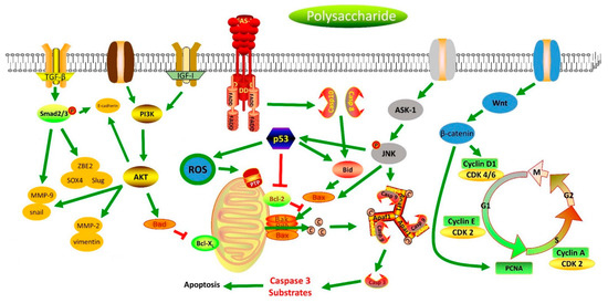 By reviewing the above literature, it can be seen that there are more than 60 polysaccharides (including single polysaccharide components and polysaccharide fractions) that have the potential to be used in the treatment of gastric cancer. Despite the large number of studies, most research shows that these polysaccharides have anti-gastric cancer effects that regulate different signal pathways, including the inhibition of the TGF-β, AKT/PI3K, IGF/IR, and Wnt/β-catenin signaling pathways, and activate the MAPK and Fas/FasL signaling pathways (Figure 3). The anti-gastric cancer signaling mechanisms of polysaccharides can be summarized as follows: They inactivate Smad2 signaling and inhibit the expression of SOX4, ZEB2, MMP9, Snail, and Slug by inhibiting the activation of the TGF-β signaling pathway [81]. Additionally, they also reduce the expression of MMP-2, MMP-9, Snail, and vimentin and upregulate the expression of E-cadherin through inhibiting the AKT/PI3K signaling pathway and inducing the apoptosis of SGC-7901 cells by increasing the expression of caspase-8, caspase-3, p53, Bax, and Bad and by reducing Bcl-2 and Bcl-xl expression through inhibiting the PI3K/AKT signaling pathway [84]. Polysaccharides also induce apoptosis in AGS gastric cancer cells via an IGF-IR-mediated PI3K/Akt pathway or by increasing PARP cleavage and Bcl-2 and by promoting caspase-3 and Cf-PS activation by decreasing the phosphorylation of IGF-IR; they also induce the apoptosis of MKN28 cells by activating the Fas/FasL signaling pathway and induce the apoptosis of SGC-7901 cells by decreasing the expression of c-myc and bcl-2 and increasing the expression of p53, fas, fas-L, and the cell factor TGF-β1 [97]. In addition, polysaccharides also inhibit 1-methyl-2-nitro-1-nitrosoguanidine-induced precancerous lesions in gastric cancer rats by downregulating the gene expression of Wnt2β, Gsk3β, PCNA, CyclinD1, and β-catenin by inhibiting the Wnt/β-catenin signaling pathway [116]. They also regulate the expression of cell cycle-associated proteins, cyclins, and CDKs by inhibiting the proliferation of MGC-803 and SGC-7901 cells by blocking the cell cycle during the G0/G1 and S phases, respectively; downregulating the expression of phosphorylated p-Cdk2T160 and p-Rb [126] and upregulating the expression of the CDK2 inhibitor by blocking the cell cycle at the G1 phase [137]; and inhibiting the proliferation of BGC-823 cells and MKN45 cells by blocking the cell cycle at the G2/M phase [82]. Moreover, polysaccharides induce the apoptosis of SGC-7901 cells and adriamycin-resistant SGC-7901 cells by enhancing the expression of caspase-3, causing DNA fragmentation and increasing the expression of tumor suppressor genes (SEMA3F, P21WAF1/CIP1, and FBXW7) by activating the MAPK signaling pathway [104]. They can also induce the apoptosis of GES-1 cells by reducing the expression of Bcl-2 and increasing the expression of caspase-8, caspase-3, p53, Bax, and Bad, and the polysaccharide HEP-1, as well as by inhibiting the expression of Bcl-2 [76,77]. Polysaccharides can also inhibit the proliferation and DNA synthesis in MKN45 cells by inhibiting the ASK1-p38 signaling pathway and inducing ROS production and JNK phosphorylation and by activating the expression of p53, caspase-9, and caspase-3 [94,95].