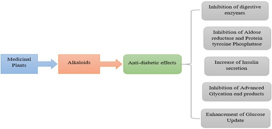It has now become necessary in the light of pronounced adverse repercussions caused by antihyperglycemic drugs to seek some alternatives that are as effective as present ones, while having fewer or no side effects. The mode of action that these medicines use includes inhibition of carbohydrate-digesting enzymes such as glucosidase and amylase, as well as modulation of additional key targets including insulin production and tyrosine kinase dysfunction [11]. The traditionally used herbs given as organic therapies that studies have found effective in treating human ailments contain various secondary constituents such as polyphenols and N-containing collection of phytonutrients known as alkaloids. These are found across the kingdom Plantae with a variety of biological and medicinal properties [12,13]. Other than kingdom Plantae, fungi (aquatic) and vertebrates are rich sources of such medically potent phytonutrients. The detailed description of the antidiabetic activity of alkaloidal phytoconstituents is depicted in Figure 1.