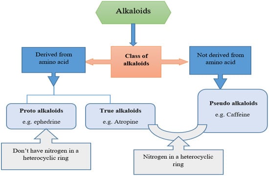 The classification of alkaloids is based on their pharmacological activities, chemical structure, biochemical origin, and taxonomical origin. Various alkaloids have been extracted from a variety of herbal plants and tested in various animal species for their potential antidiabetic effects. Alkaloids are mainly classified into two categories in which one class includes alkaloids derived from amino acids (proto alkaloids and true alkaloids) and the other class includes alkaloids not derived from amino acids (pseudo alkaloids). Further, the alkaloids derived from amino acids are categorized as proto alkaloids which are derived from amino acids and do not constitute a nitrogen moiety in a heterocyclic ring, e.g., ephedrine, and true alkaloids, which are derived from amino acids and have nitrogen in a heterocyclic ring, e.g., atropine. Additionally, there is a category of pseudo alkaloids that are not derived from amino acids but have nitrogen in a heterocyclic ring, e.g., caffeine. The pictorial presentation of the classification of alkaloids is shown in Figure 2.