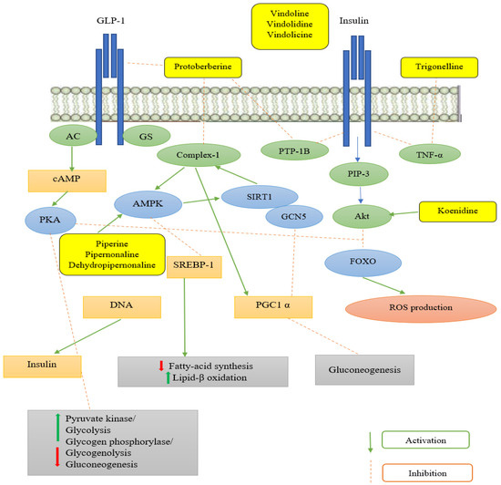 By permitting glucose transporter 4 (GLUT-4) to translocate, extreme efforts aid in the management of diabetes mellitus. Various alkaloids from medicinal flora have been reported to increase glucose absorption. In correlation to vindoline I, II, and IVIII from Catharanthus roseus (L.), G. Don has been implicated in glucose uptake in TC6 and C2C12 cells as well as the carotenoid uptake, trying to prove to be beneficial in high blood sugar. Likewise, the identical plant’s vindogentianine causes a significant increase in glucose absorption in TC6 pancreas and C2C12 muscle tissue [81]. Alkaloids stimulate the GLUT-transporter’s translocation by performing allosteric activation of AMP-activated protein kinase. This kinase is known as the cellular fuel sensor and glucose transporter regulator. It stimulates glucose uptake and modulates insulin secretion. A study has suggested alkaloids stimulate the GLUT4-translocation via activation of the AKT (Ser473)-dependent signaling pathway [82].