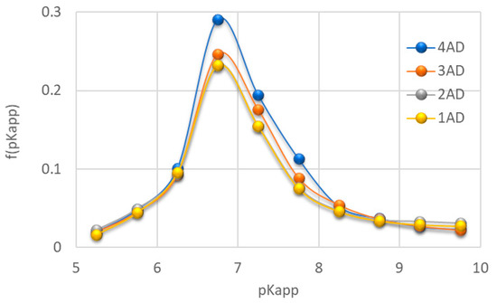 Distribution function of apparent dissociation constants for the studied teeth samples (1AD-incisors, 2AD-canines, 3AD-premolars, 4AD-molars).