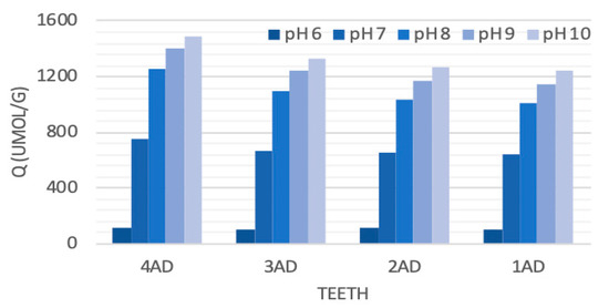 Results of potentiometric titrations allowed to determine the distribution function of apparent dissociating constants (Figure 2), as well as the titrant consumption (Q) for the same pH conditions (Figure 3). It should be noted that the Q for different pHs should be treated as relative values due to the fact that titration was possible from pH 5. Obtained data show that NaOH titrant volume needed to reach pH 10 varied between the samples tested. The highest, total volume of the titrant was used for the analysis of the 4AD (molars), and the lowest one for the 1AD (incisors) and 2AD (canines), which could mean the highest and the lowest number of negatively dissociating functional groups in samples 4AD (molars), as well as 1AD (incisors) and 2AD (canines), respectively.