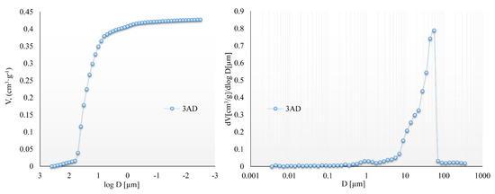 Mercury porosimetry was performed on the Autopore IV 9500 apparatus (Micromeritics, Norcross, GA, USA), allowing pore characteristics, including total porosity, average pore diameter (D), total pore area (S), and pore volume (V), to be estimated. Cumulative and differential pore size distributions were obtained in the diameter range of 0.003 to 360 μm. Before analysis, powdered samples were dried at 105 °C to remove water and gaseous pollutants. The applied intrusion pressure was converted into the pore diameter by using the Washburn equation. In calculation, an assumption was made that the pore system consists of parallel, cylindrical, non-intersecting pores of different diameters, which are entirely and equally connected to the outer surface of the material and thus were available to mercury.