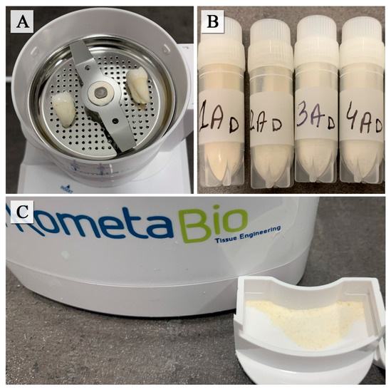 Human teeth inside the “Smart Dentin Grinder” chamber (A), prepared samples (B), compartment of particles (C).
