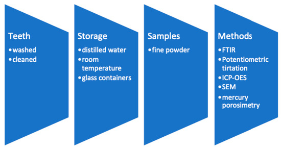 The study protocol was approved by the Medical University of Lublin Ethics Committee (registration number KE-0254/154/2021). The human teeth used for the examination were sound teeth without any pathologies, extracted because of trauma, periodontal disease and orthodontic reasons, A total of 50 teeth were collected from 50 donors. The teeth were washed in water to remove any traces of blood. Then they were cleaned using straight fissure carbide burs, trimming the periodontal ligament and dried with an air syringe. The teeth were divided into four groups: 1AD–incisors, 2AD–canines, 3AD–premolars, 4AD–molars. The teeth prepared in this way were stored in separate glass containers at room temperature in distilled water, which was changed daily to avoid deterioration. Teeth after being dried were crushed using the “Smart Dentin Grinder” device (KometaBio Inc., Cresskill, NJ, USA) (Figure 6A–C). A fine powder was used for the FTIR (Fourier Transform Infrared Spectroscopy), ICP (Inductively Coupled Plasma Optical Emission Spectometry) and for potentiometric titration, SEM and mercury porosimetry analyses (Figure 7).