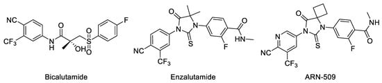 AR antagonists are currently the mainstay of treatments for prostate cancer [4]. Bicalutamide, enzalutamide and apalut salts are marketed as nonsteroidal antiandrogens [5,6,7]. As a first-generation nonsteroidal AR antagonist, bicalutamide diminishes androgenic effects by competitively inhibiting androgen–AR binding. However, due to the occurrence of LBD point mutations and the expression of active AR splice variants, these antiandrogens may become partial AR agonists after a period of treatment (~2 years) [5]. (Figure 1).