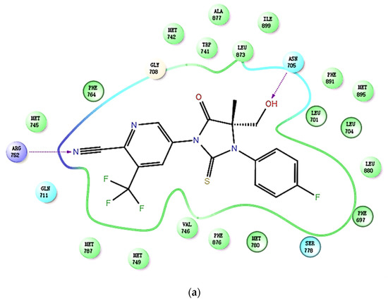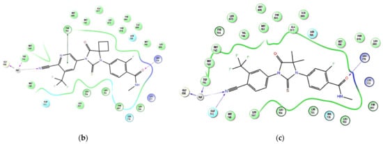 In addition, by using Schrödinger to study the binding mode of compound 19b to AR (PDB ID: 2OZ7), it was found that the binding posture of 19b was very similar to that of enzalutamide. The critical interactions of 19b with the critical residuals are shown in Figure 3a. The cyanyl group of 19b forms an important hydrogen bond with GLY708, Gln711, and TRP741 via a water molecule, similar to enzalutamide and apalutamide (Figure 3b,c). There is a π–π interaction between the pyridine ring and Phe764, which is similar to apalutamide (Figure 3b). Enzalutamide and apalutamide can form a hydrogen bond with ARG779 due to the presence of an acyl group. Obviously, the absence of an acyl group in 19b hinders the formation of this hydrogen bond. However, the extra hydroxyl group in 19b can form a hydrogen bond with ASN705 in the AR, which may be the reason for the high potency of 19b toward AR.