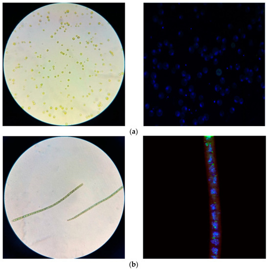 Light microscopy and fluorescence micrography (Bodipy and Dapi staining) of lipid inclusions in the cells of (a) C. Vulgaris; (b) A. platensis.