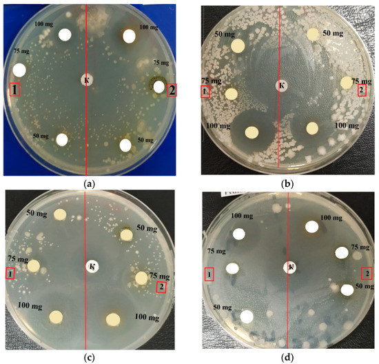 Inhibition zones (a) E. coli; (b) L. mesenteroides; (c) B. pumilus; (d) P. pentosaceus: 1—A. platensis; 2—C. vulgaris.
