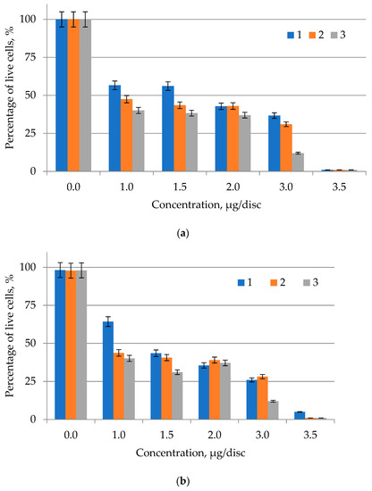 The cancer cell lines were cultured for 24 h. Subsequently, the cells were exposed to lipid complexes of microalgae at concentrations corresponding to their IC50, and cell viability was assessed after 12, 24, 36, and 48 h. After 48 h treatment, the medium was replaced with fresh medium (without extract), and the cells were cultured for another 12 h and 24 h. Cell viability was determined by the conventional trypan blue exclusion method. For this, 20 μL of a suspension of the studied lipid complexes of microalgae C. vulgaris and A. platensis was mixed with 20 μL of a 0.2% trypan blue solution prepared in buffered saline (pH 7.4) with the addition of 0.02% (by volume) sodium azide, and the total number and the number of living cells were counted in Goryaev’s chamber [47]. Cells not treated with the lipid complex of microalgae were used as a control. The number of viable SK-MEL-2 cancer cells was assumed to be 100%. During the experiment, the following correlation was considered: 1 μg/mL = 10 μg/disc.
