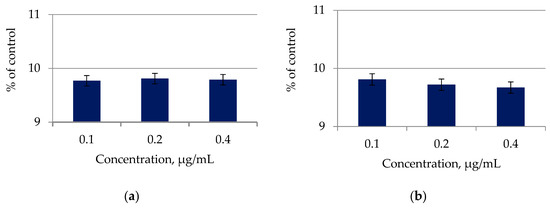 Similar results of the C. vulgaris antimicrobial activity study are presented in [23,24,25,26]. It was found that the lipid extract of C. vulgaris at a concentration of 15.0 µg/disc exhibited antimicrobial activity against the tested organisms. The diameters of the zones of inhibition were as follows: A. niger 51 mm; C. albicans 47 mm; E. coli 24 mm; S. aureus 25 mm. Lipid extract of C. vulgaris showed antibacterial activity against Gram-negative (E. coli) and Gram-positive (S. aureus) bacteria. In other studies, extracts of green unicellular algae demonstrated pronounced antagonistic activity against numerous opportunistic and pathogenic bacteria [27]. The A. platensis lipid fraction also showed an inhibitory effect against pathogenic and opportunistic microorganisms (including E. coli) [17]. These results confirm the potential of C. vulgaris lipid extracts for the production of natural fungicides and bactericides. However, the study [28] investigated only the extract of Chlorella vulgaris grown on a postfermentation filter of a biogas plant with vinasse and corn silage, while we isolated microalgae C. vulgaris and A. platensis from the Baltic Sea in the Kaliningrad region. Only the lipid–pigment complex was used as an extract.