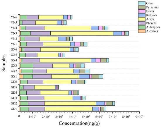 The average contents of odor compounds in brown sugar samples from the three regions are shown in Figure 1. It can be seen that the highest contents of acid compounds were found in all three regions with 25,595.06, 21,632.44 and 25,187.12 ng/g, followed by phenolic compounds with average contents of 111,69.29, 12,115.37 and 11,744.16 ng/g. In contrast, alcohols, esters, pyrazines and ketones had lower contents.