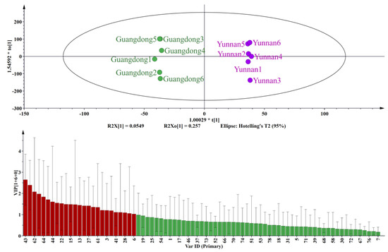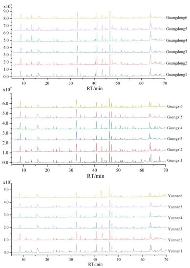 The fingerprinting analysis of samples from the three origins of Guangdong, Guangxi, and Yunnan revealed that the majority of samples within each province had similar odor types. In addition, a supervised OPLS-DA multivariate statistical analysis method was used to establish a statistical model in order to distinguish odor compounds between Guangdong and Guangxi, Guangdong and Yunnan, and Guangxi and Yunnan.