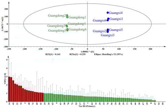 OPLS-DA analysis and VIP diagram of brown sugar in Guangdong and Guangxi.