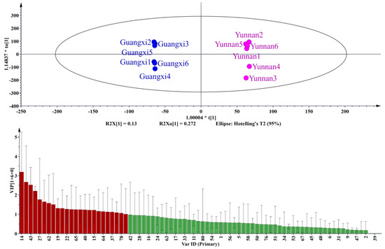 By conducting OPLS-DA analysis on the brown sugar, a variable importance of projection diagram (VIP) of the model was obtained. A VIP is a vector that summarizes the contribution of a variable to the explanation of the model. Variables with a VIP >1 are generally considered to contribute to the explanation of the model [31,32]. The samples were assessed as independent variables, and the OPLS-DA model was fitted automatically.