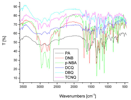 We purchased all chemicals from Aldrich and Fluka Chemicals. We utilized FXN drug and the six π-acceptors without additional purification: picric acid (PA); p-nitro benzoic acid (p-NBA); 2,6-dichloroquinone-4-chloroimide (DCQ); 2,6-dibromoquinone-4-chloroimide (DBQ); dinitrobenzene (DNB); and 7,7′,8,8′-tetracyanoquinodimethan (TCNQ) (Figure 20).