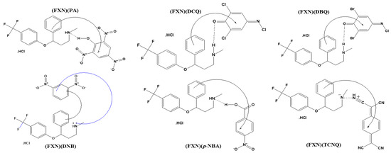The infrared spectrum of FXN had different stretching vibration bands at 3500 cm−1 (N–H stretching), 3200–3000 cm−1 (C−H stretching), 1600–1400 cm−1 (C=C stretching), 1300 cm−1 (C–O stretching), and 1200–1000 cm−1 (C–F stretching) [31]. After CT complexation, the υ(N–H) band was absent, and the δ(NH) band shifted to lower wavenumbers (1611–1629 cm−1). These alterations could result from a single pair of -NH electrons interacting with the six acceptors. The n–π* CT transitions caused the C=C stretching frequency to decrease from 1590 cm−1 to 1569–1537 cm−1. In addition, the stretching vibration of υ(C–N) shifted to 1349–1324 cm−1 in all six acceptors with the FXN drug complexes according to the interaction between –NH and the acceptors (Figure 1).