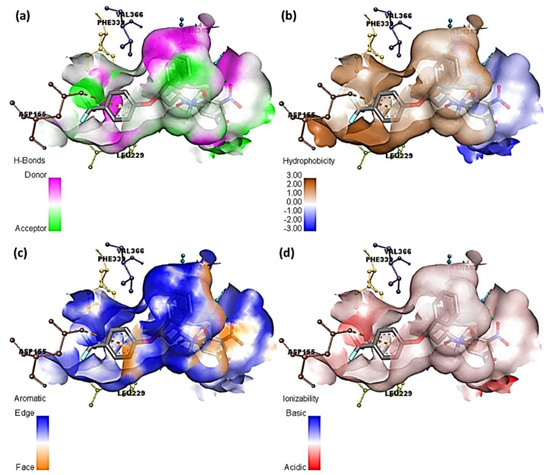 Herein, fluorine atoms play a significant role in hydrogen-bond formation. The hydrogen-atom acceptor area is indicated in green, and the donor area is indicated in pink for the amino acid residues at the hydrogen-bond surface in Figure 8a and Figure S1a. The presence of the hydrophilicity features of the receptor around the ligand is confirmed by the hydrophobicity surface (Figure 8b and Figure S1b). Further, the aromatic face/edge surface (Figure 8c and Figure S1c, orange/blue = face/edge) was revealed using the docking outputs. The ionization surface reflected the acidic and basic propensity (Figure 8d and Figure S1d, blue color = basic and red color = acidic) [36].