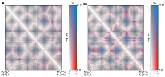 The standard deviation and average distance between each pair of amino acids for each conformation were displayed using RR distance maps (Figure 12) [39,40].
