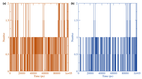 The amount of hydrogen-bond interactions that have arisen in ligand–receptor combinations (FXNS and CTpS) were plotted against time using a grid-search at grid = 25 × 11 × 14 and rcut = 0.35 (Figure 14).