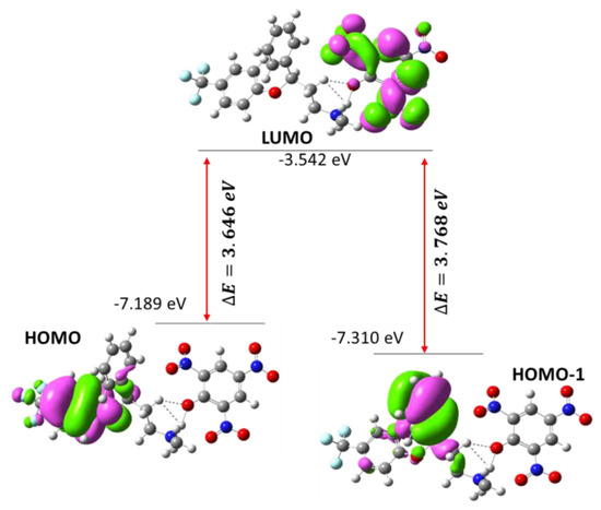 TD-DFT was used to examine the nature of electronic transitions in water. The TD-DFT yielded two electronic absorption bands at 436 and 451 nm. HOMO → LUMO and HOMO-1 → LUMO were allocated at 451 and 436 nm, respectively. The electron acceptors were mainly LUMO and electron donors were HOMO, as observed in the FXN moiety of the CT complex [(FXN)(PA)]. Figure 17 represents the HOMO and LUMO spatial arrangements and their gaps and associated energies.