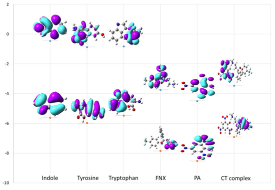 DFT calculations were employed to explain the stability of the CT complex [(FXN)(PA)] (Figure 19). To study the effect of the aromatic residues (indole, tyrosine, and tryptophan) of the protein on the CT complex [(FXN)(PA)], the HOMO LUMO energy and band gap were calculated for indole, tyrosine, tryptophan, FXN, PA, and [(FXN)(PA)] (Figure 19). The energy difference between HOMO and LUMO has an impact on how chemically stable molecules are. As previously reported, ligands with a smaller band gap are soft in nature, have low kinetic stability, and higher chemical reactivity [47]. The opposite is true for ligands with a wide energy gap, which are harder by nature, more unstable, and more chemically reactive [45,47]. The band gap energy of [(FXN)(PA)] is calculated as 3.646 eV, which is the smallest among all of the complexes, suggesting higher stability. On the other hand, the obtained energy of LUMO = −4.494 eV and HOMO = −8.524 eV for PA, and LUMO = −3.746 eV and HOMO = −7.849 eV for FXN (Table 4), validates the easy transfer of electrons from HOMO of FXN to LUMO of PA, and results in the formation of a stable CT complex with a smaller band gap [(FXN)(PA)]. Furthermore, the calculated LUMO energies of the aromatic residues (indole, tyrosine, and tryptophan) of the protein were not in the sequence (close enough) to dissociate the charge transfer bond between FXN and PA, ensuring the stability of the [(FXN)(PA)] complex [42,44,48,49].
