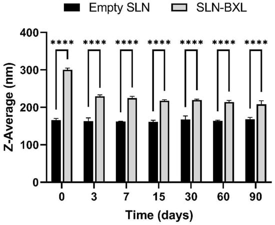 Regarding zeta potential, during the first 15 days, both unloaded and loaded SLN show an increment of said absolute value up to −28 mV. Following that day, unloaded SLN undergoes a non-linear decrement of ZP whereas SLN-BXL remains almost unchanged, possibly indicating a balancing effect of BXL on the electrical behavior of SLN.