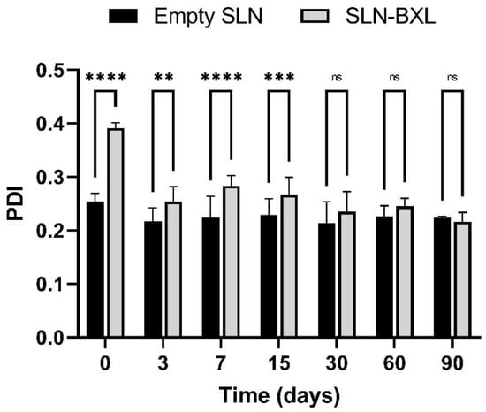 SLN polydispersity index (PDI). The results are shown as mean ± standard deviation. Confidence intervals calculated by two-way ANOVA: ns = not significant; ** = p < 0.01; *** = p < 0.001; **** = p < 0.0001.