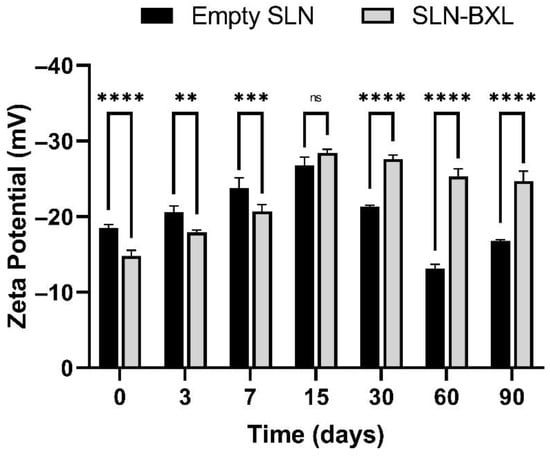 SLN zeta potential. The results are shown as mean ± standard deviation. Confidence intervals calculated by two-way ANOVA: ns = not significant; ** = p < 0.01; *** = p < 0.001; **** = p < 0.0001.