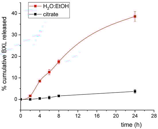 In vitro BXL release profile in citrate buffer (pH 5; black line) and in H2O:EtOH 80:20 mixture (red line). The data plotted are means (n = 3) ± SD.
