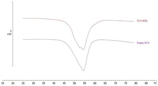 The thermotropic behavior of the SLN was evaluated by DSC analysis (Figure 7). The calorimetric curve of empty SLN is characterized by a main peak at 54.40 °C and a shoulder on lower temperature. In the SLN-BXL calorimetric curve, as the temperature increases, a smaller shoulder, a secondary peak at 52.80 °C, and the primary peak at 54.60 °C are observed. The prominent differences among the empty and SLN-BXL calorimetric curves suggest that BXL is inside the SLN structure, affecting its response to heat and temperature-based transitions.