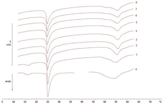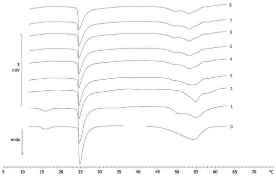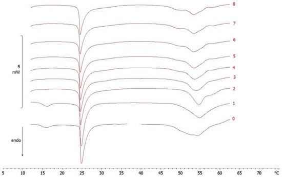Calorimetric curves, in heating mode, of MLV put in contact with empty SLN, at pH 5, at increasing incubation time. The numbers on the right side of the curves refer to the calorimetric scans. The curves 0 refer to the samples before contact.